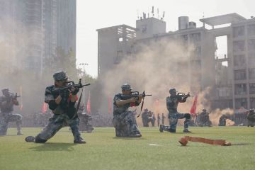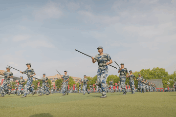 大刀表演、女子捕俘刀、军体拳等特色方阵紧随其后,一群“迷彩”脚步划一、动作整齐,在一阵阵“杀”声中精彩展现。战场战术表演中,烟雾四起,警报鸣响,战术组成员整装待发、匍匐前进,我校崇实战队自主创作的智能机器人也参与其中,满满科技感引得全场掌声阵阵。分列式方队踏步入场,跟随鼓点,铿锵有力,顺利完成检阅。