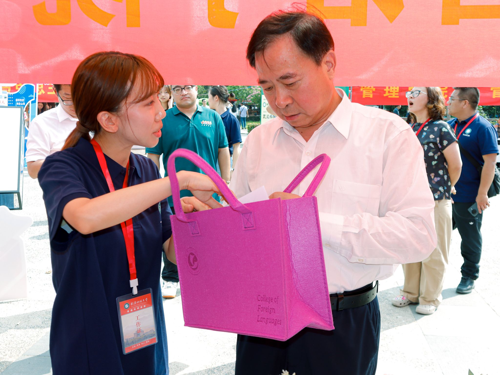 化工学院志愿者为校党委副书记孙国胜介绍文创杯子 王铭浩摄