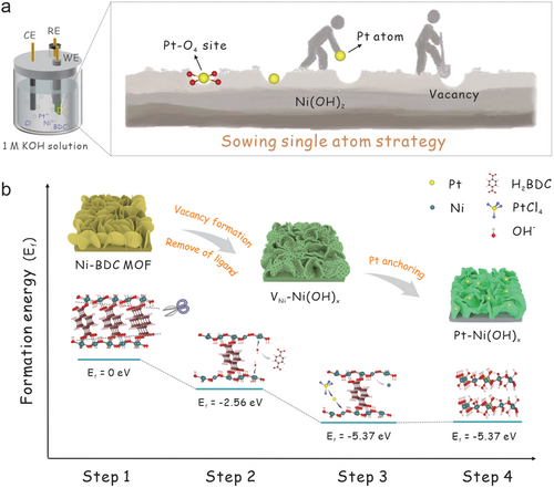 基于此,该论文提出了一种合成超低负载NMSACs的单原子播种策略。通过电化学还原金属有机骨架(MOF),得到了含Ni2+空位的氢氧化镍(VNi-Ni(OH)x),其具有丰富的捕获孔。将它作为基底可以插入Pt原子种子。Pt原子倾向于形成四配位Pt-O4作为根,将负载浓度限制在超低范围(≈ 0.17 wt%)。同时,实验表征和理论计算证明,所制备的Pt-O4四配位结构能有效地固定Pt单原子,防止铂原子聚集。