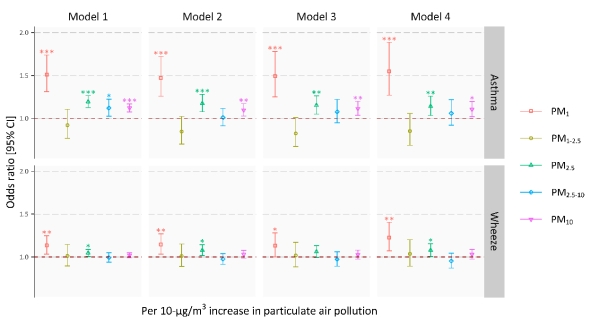 研究结果显示,生命早期PM1暴露浓度每增加10 μg/m3,儿童哮喘患病风险的升高55%(OR,1.55;95% CI,1.27–1.89),高于PM2.5(OR,1.14;95% CI,1.03–1.26,PM2.5浓度每增加10 μg/m3)和PM10(OR,1.11;95% CI,1.02–1.20,PM10浓度每增加10 μg/m3),表明颗粒物粒径越小,比值比的估计值越高。同时发现PM1-2.5暴露与儿童哮喘患病风险之间的关联无统计学意义,表明是PM1而非PM1-2.5贡献了PM2.5与儿童哮喘患病风险之间的关联。