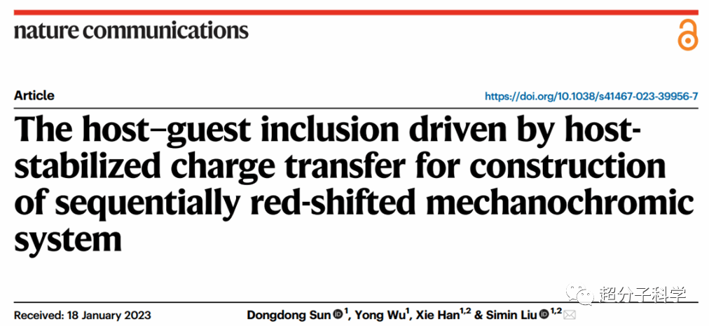 武科大网讯(通讯员吴蔓玲)近日,我校化学与化工学院刘思敏教授团队在顶级期刊《自然·通讯》发表了题为“The host-guest inclusion driven by host-stabilized charge transfer for construction of sequentially red-shifted mechanochromic system”的研究论文。博士生孙冬冬为第一作者,刘思敏为通讯作者,论文第一单位为我校化学与化工学院。