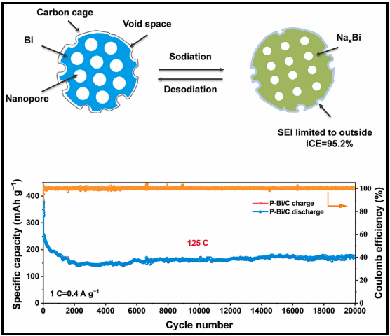 针对钠离子电池合金负极在充放电过程中体积膨胀大、扩散动力学缓慢的问题,研究团队设计了具有双连续分级纳米孔结构一种原位碳包覆的多孔铋微米颗粒,这种独特的结构设计使其在快充型钠离子电池中具有较大应用潜力。该成果发表在Cell子刊Cell Reports Physical Science(IF: 8.9)上,博士生郭思广为本文第一作者,霍开富教授和高标教授为通讯作者。