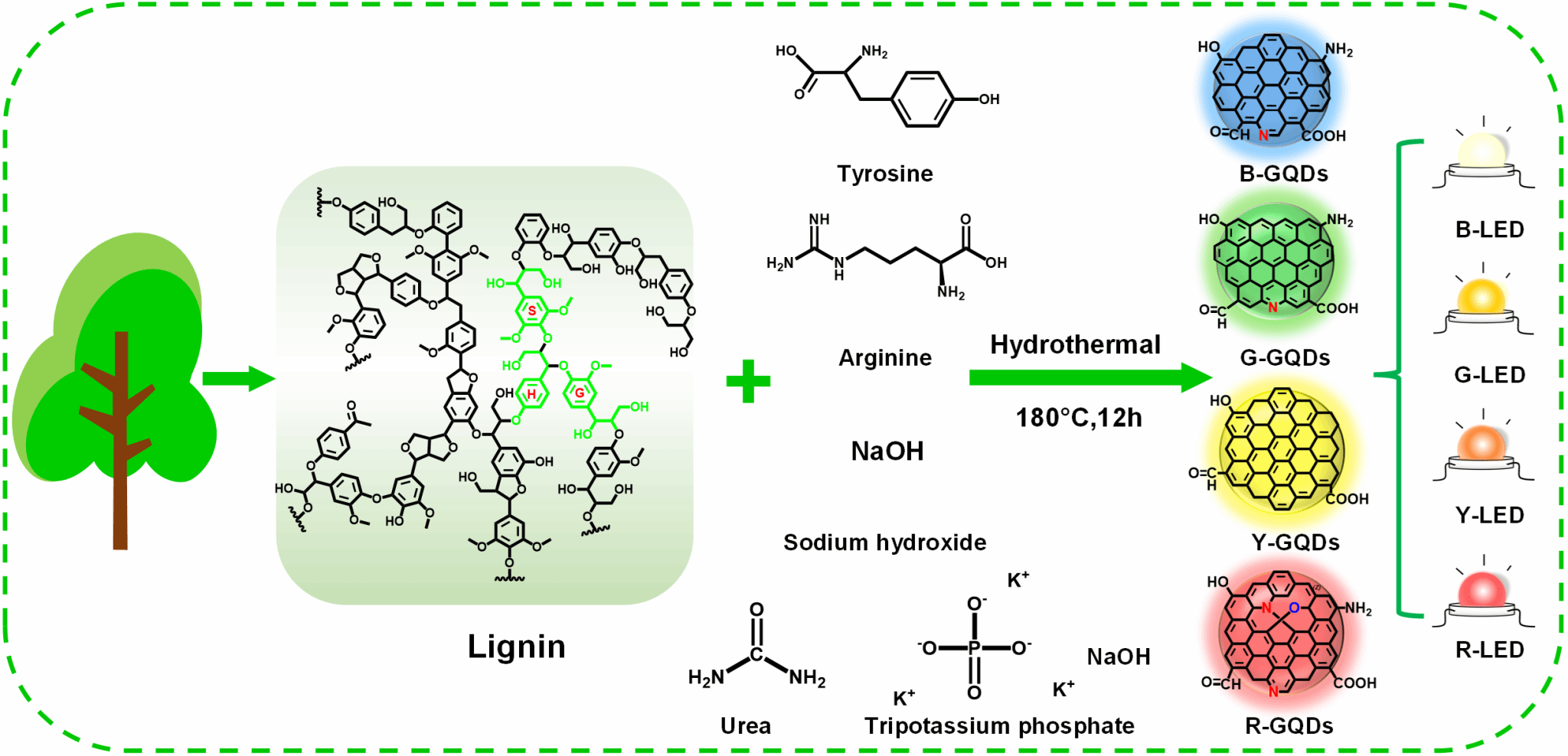 木质素高价值转化对生物资源开发具有重大意义。该论文以木质素为原料,制备出红、黄、绿、蓝四色发光高结晶度单层石墨烯量子点,并成功将其应用于多色LED灯。该研究建立了一种从生物质合成多色发光高结晶度石墨烯量子点的新方法,摆脱了对传统化石原材料的依赖,成功减少碳足迹,这为石墨烯量子点的低成本、环保、可持续制备提供了新思路。多色发光LED灯的制备,有效拓展了石墨烯量子点的应用领域,为其产业化开辟了新路径。