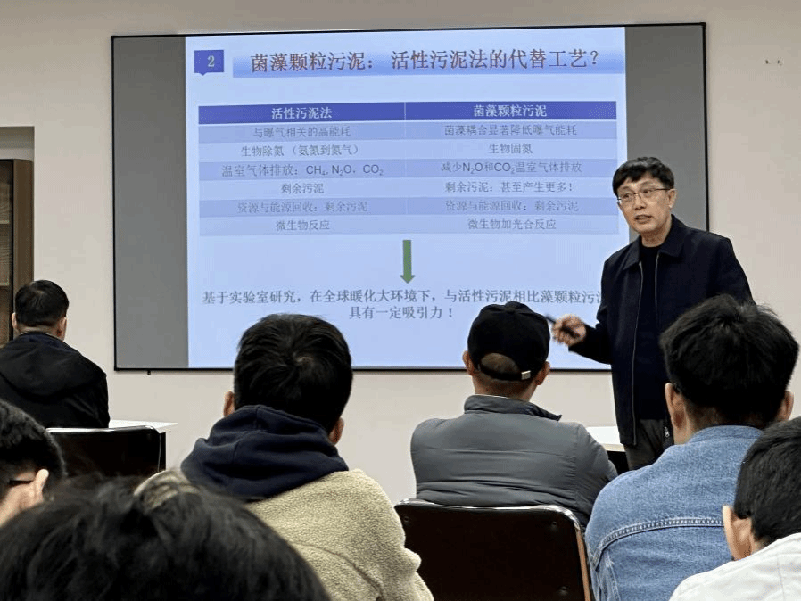 对于菌藻颗粒工程化需要解决的问题,刘雨指出了未来的发展方向。讲座结束后,师生踊跃发言,刘雨耐心细致地回答了参会师生提出的问题。报告会的最后,刘雨勉励同学们要理论与实践相结合,为水处理事业贡献自己的力量。